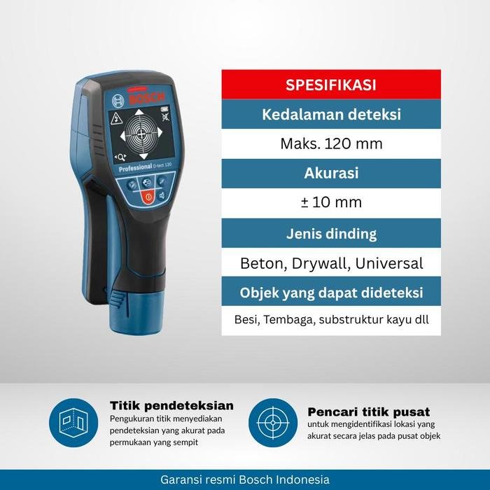 Bosch D-Tect 120 (Professional) adalah alat deteksi (scanner) radar untuk menemukan objek tersembunyi di dalam dinding, lantai, atau struktur lain (misalnya logam, pipa, kabel, kayu). Perangkat ini dilengkapi dengan layar berwarna yang menampilkan posisi dan kedalaman objek secara jelas, sehingga memudahkan pengguna dalam menentukan area aman untuk pengeboran atau pemotongan.