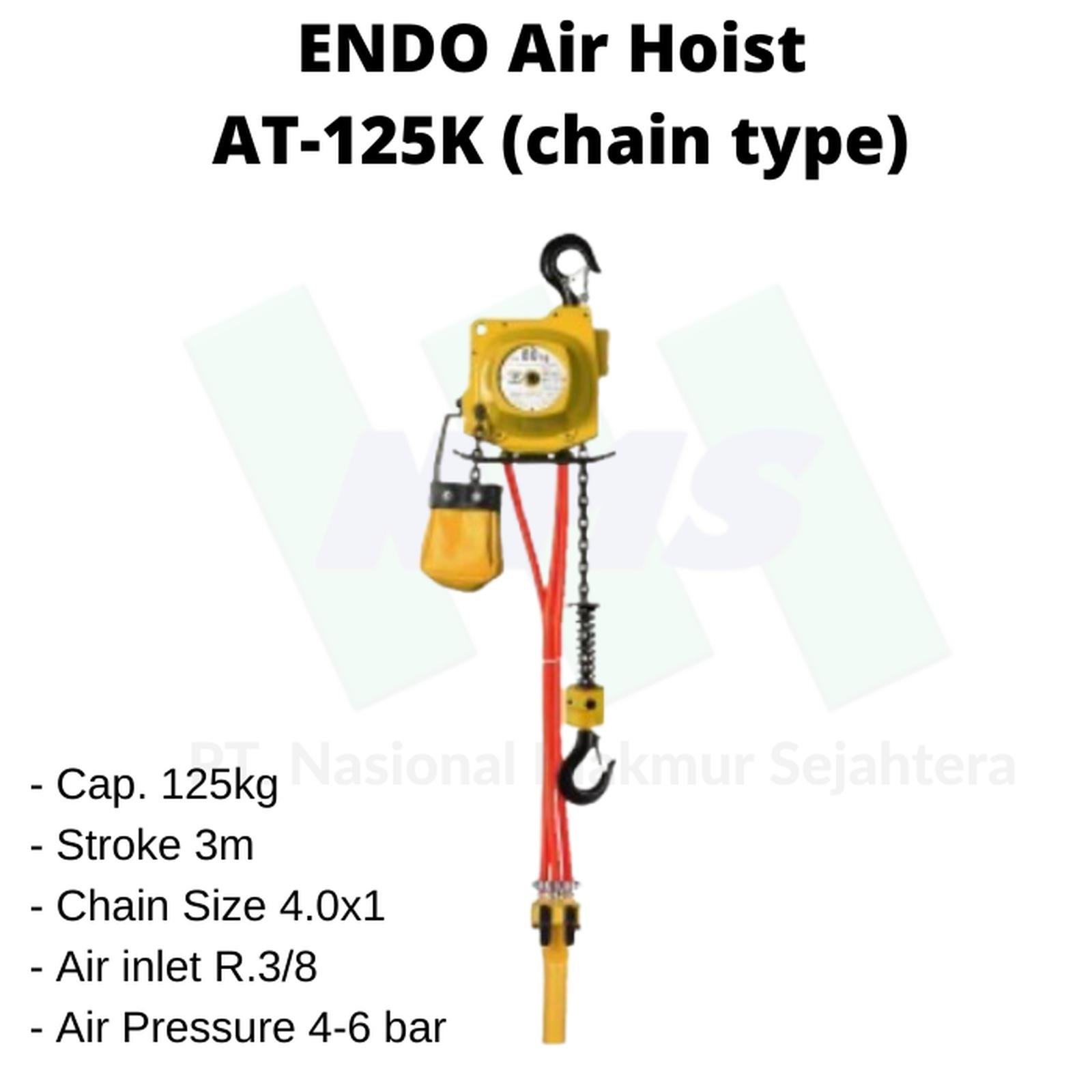ENDO Air Hoist AT-125K adalah hoist udara tipe rantai berkapasitas 125 kg yang dirancang untuk aplikasi pengangkatan ringan di lingkungan industri,Menggunakan rantai baja paduan (alloy steel) yang kuat dan tahan aus.