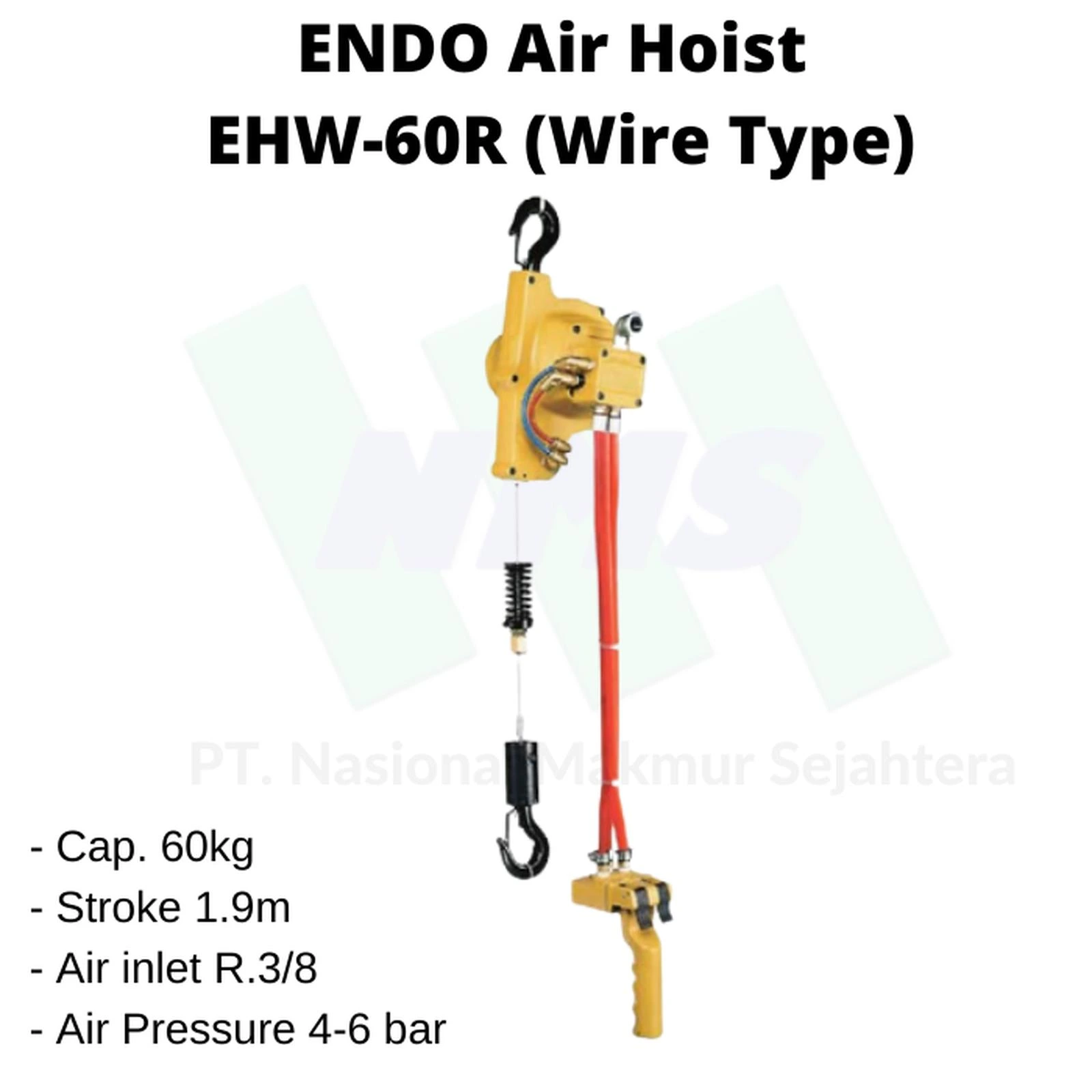 ENDO Air Hoist EHW-60R (Wire with Remote Type) merupakan alat pengangkat bertenaga udara yang dirancang untuk menangani beban hingga 60 kg dengan panjang stroke 1,9 meter.Hoist ini menggunakan sistem wire rope dan dilengkapi remote pendant control untuk pengoperasian yang aman dan mudah.