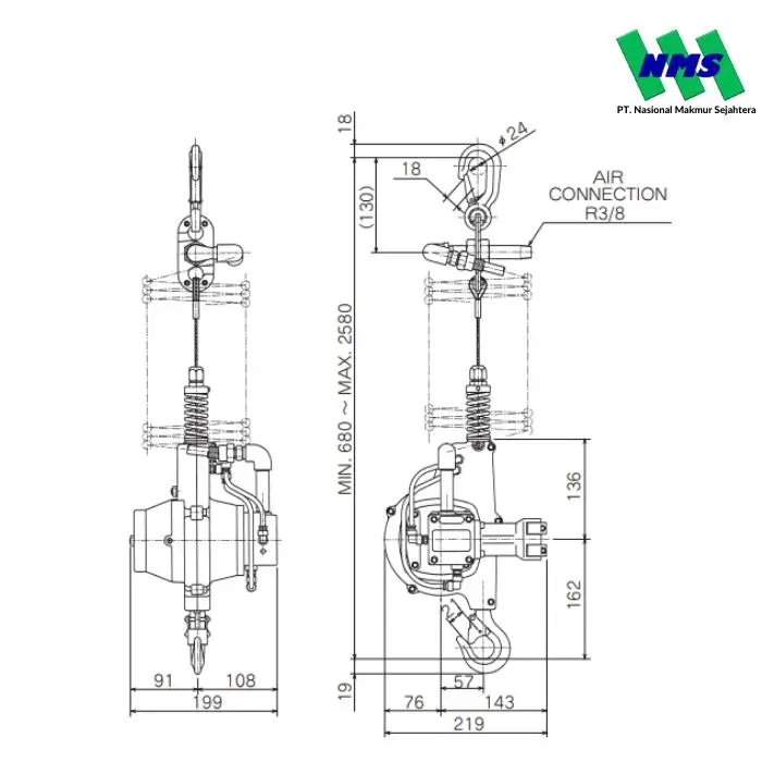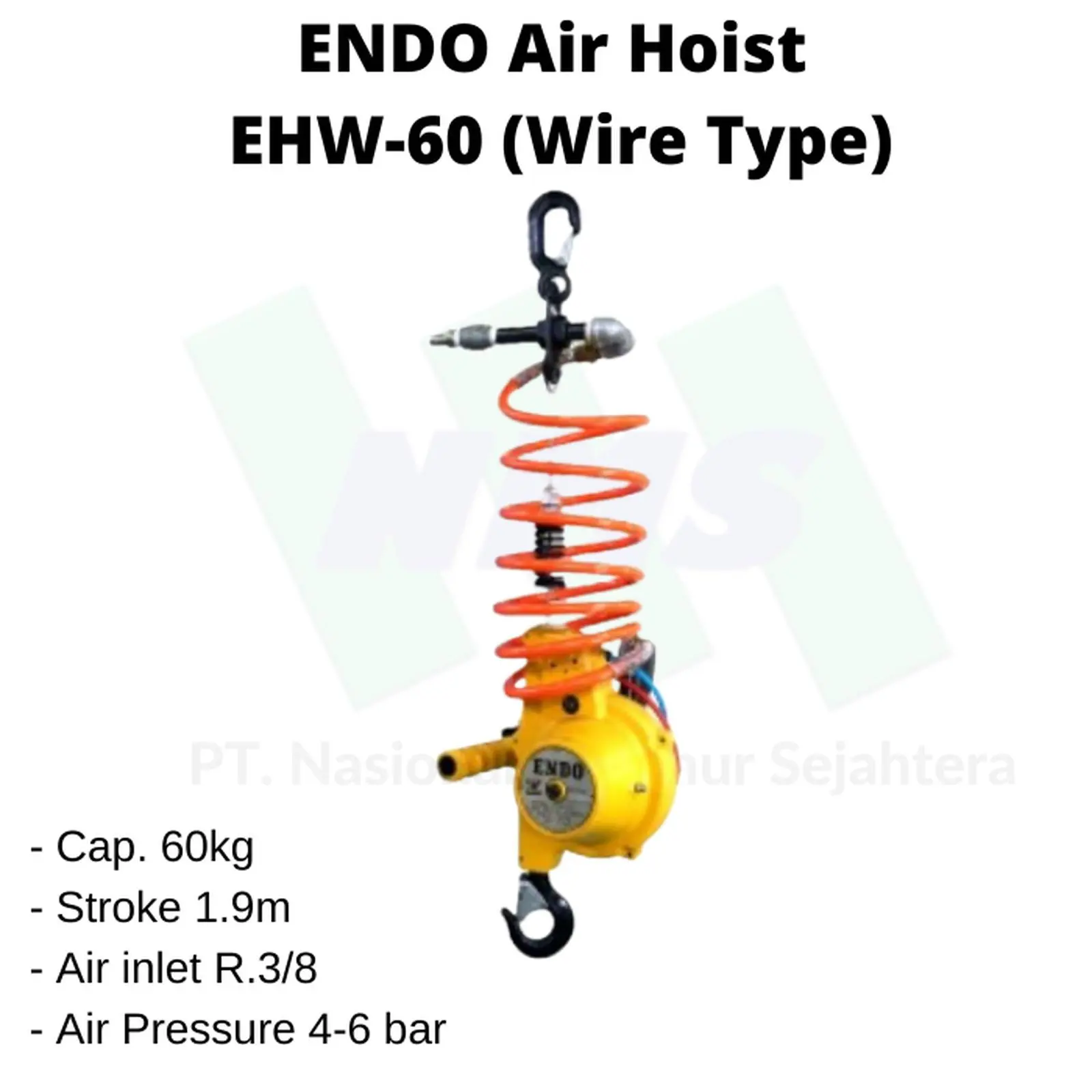 Air Hoist ENDO EHW-60 (Wire Type) adalah alat pengangkat bertenaga udara dengan kapasitas angkat 60 kg dan panjang stroke 1,9 meter. Hoist ini menggunakan sistem wire rope yang ringan dan efisien.