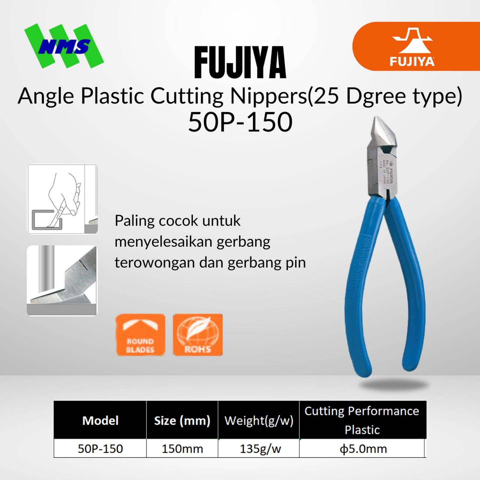 Fujiya 50P-150 adalah Angle Plastic Cutting Nippers tipe 25° yang dirancang khusus untuk memotong plastik di ruang sempit. Tang ini panjangnya sekitar 150 mm dan beratnya ± 135 gram. Mampu memotong plastik resin hingga diameter φ 5,0 mm.