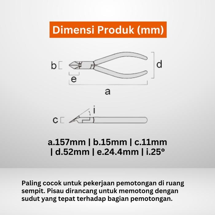 Kepalanya memiliki sudut miring (25°) agar bilahnya dapat meraih dan memotong benda yang sulit dijangkau dengan mudah. Tang ini sangat cocok untuk finishing pada bagian cetakan plastik seperti tunnel gate dan pin gate, tempat di mana potongan yang rapi sangat penting.