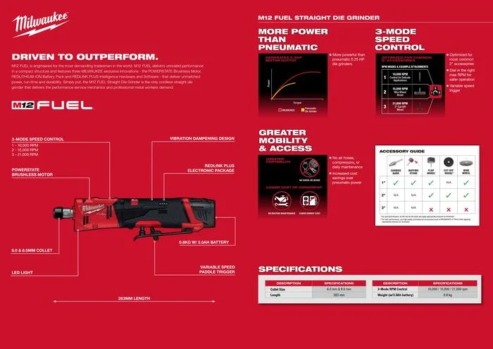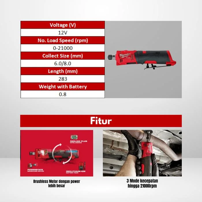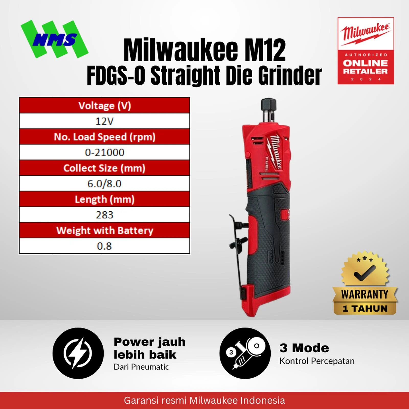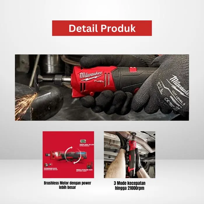 Mesin Gerinda Milwaukee M12 FDGS-0 FUEL Cordless Straight Die Grinder adalah alat gerinda portabel bertenaga baterai 12 V dari seri M12 yang dirancang untuk memberikan performa tinggi dalam ukuran ringkas. Ditenagai motor brushless POWERSTATE dan sistem cerdas REDLINK PLUS, alat ini mampu menghasilkan kecepatan hingga 21.000 rpm dengan tiga mode kecepatan yang dapat disesuaikan.