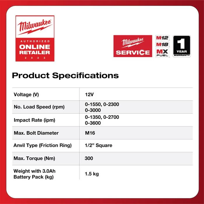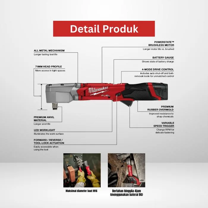 Milwaukee M12 FRAIWF12-0 FUEL 1/2″ Cordless Right Angle Impact Wrench adalah kunci impact sudut kanan bertenaga baterai 12 V yang dirancang untuk bekerja di area sempit dengan performa tinggi. Ditenagai motor brushless POWERSTATE™ dan sistem elektronik REDLINK PLUS™, alat ini mampu menghasilkan torsi pengencang hingga 270 Nm dan torsi pemecah mur hingga 300 Nm.