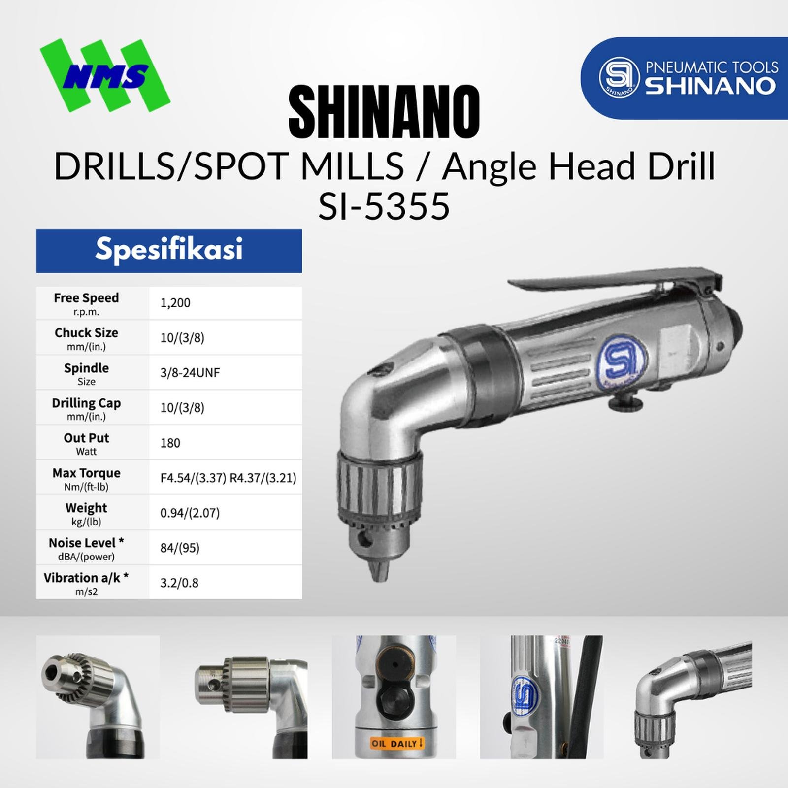 Shinano SI-5355 adalah mesin bor angin tipe angle head (bor sudut) berukuran 10 mm yang dirancang untuk bekerja di area sempit.