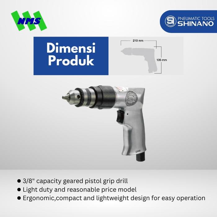 Shinano SI-5500 adalah pistol grip air drill berukuran 3/8 inci (10 mm) yang dirancang untuk pekerjaan pengeboran ringan hingga menengah dengan kecepatan tinggi dan presisi tinggi.