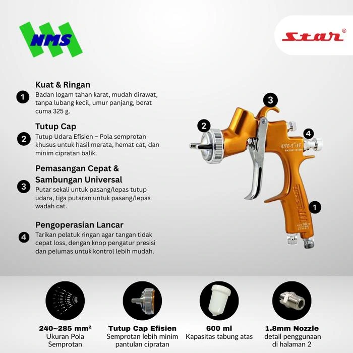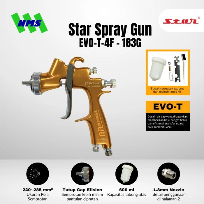 STAR Spray Gun Gravity Type EVO-T-4F-183G adalah alat semprot cat profesional dengan sistem gravity feed, di mana tangki cat berada di atas sehingga aliran cat lebih stabil dan efisien. Dilengkapi nozzle berukuran 1.8 mm dan tangki 450 ml, spray gun ini cocok untuk pekerjaan pengecatan dengan volume besar seperti otomotif, furnitur, dan industri umum.