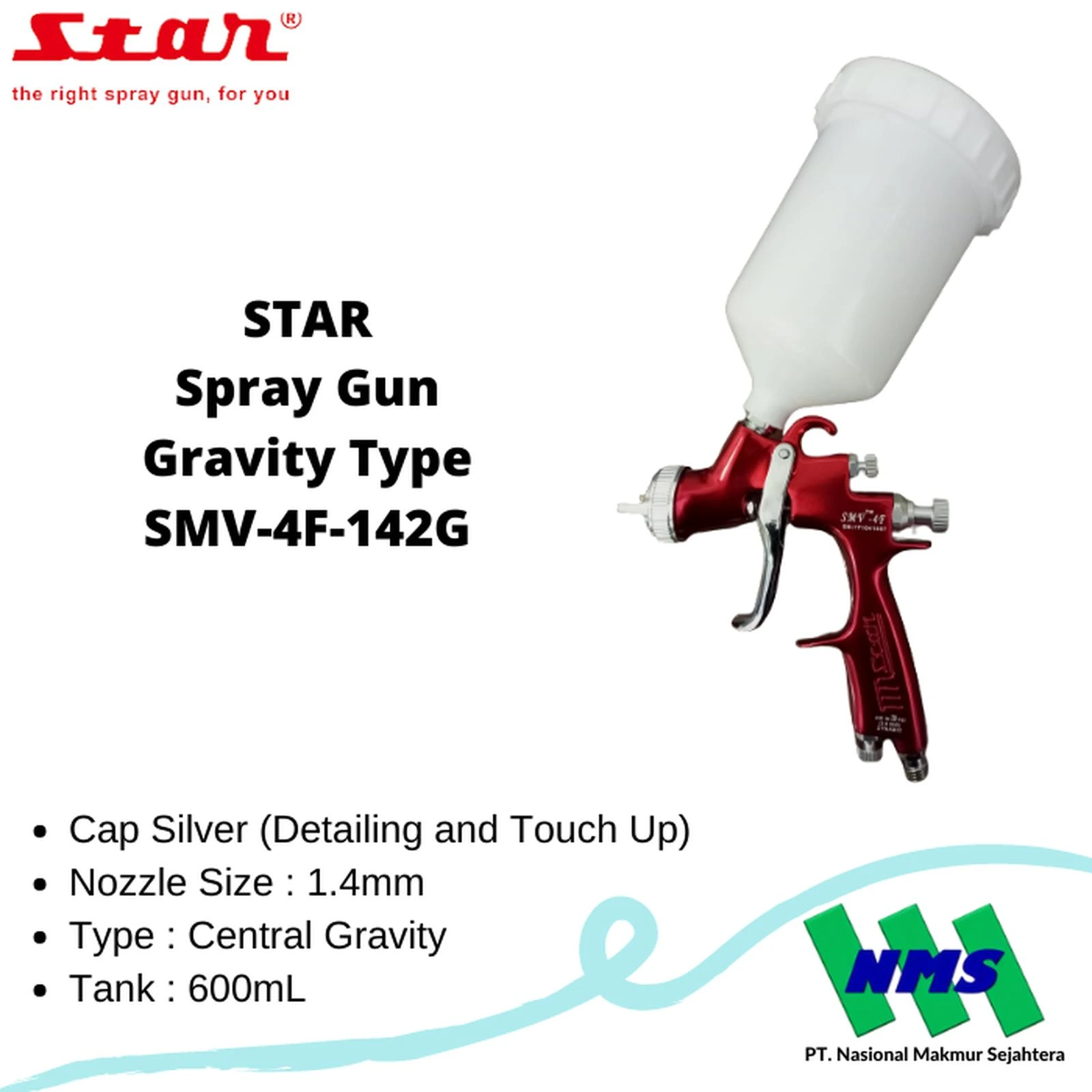 STAR Spray Gun Gravity Type SMV-4F-142G merupakan spray gun profesional dengan sistem gravity feed yang dirancang untuk hasil pengecatan halus dan presisi. Menggunakan nozzle berukuran 1.4 mm, alat ini ideal untuk aplikasi base coat dan clear coat pada bidang otomotif.