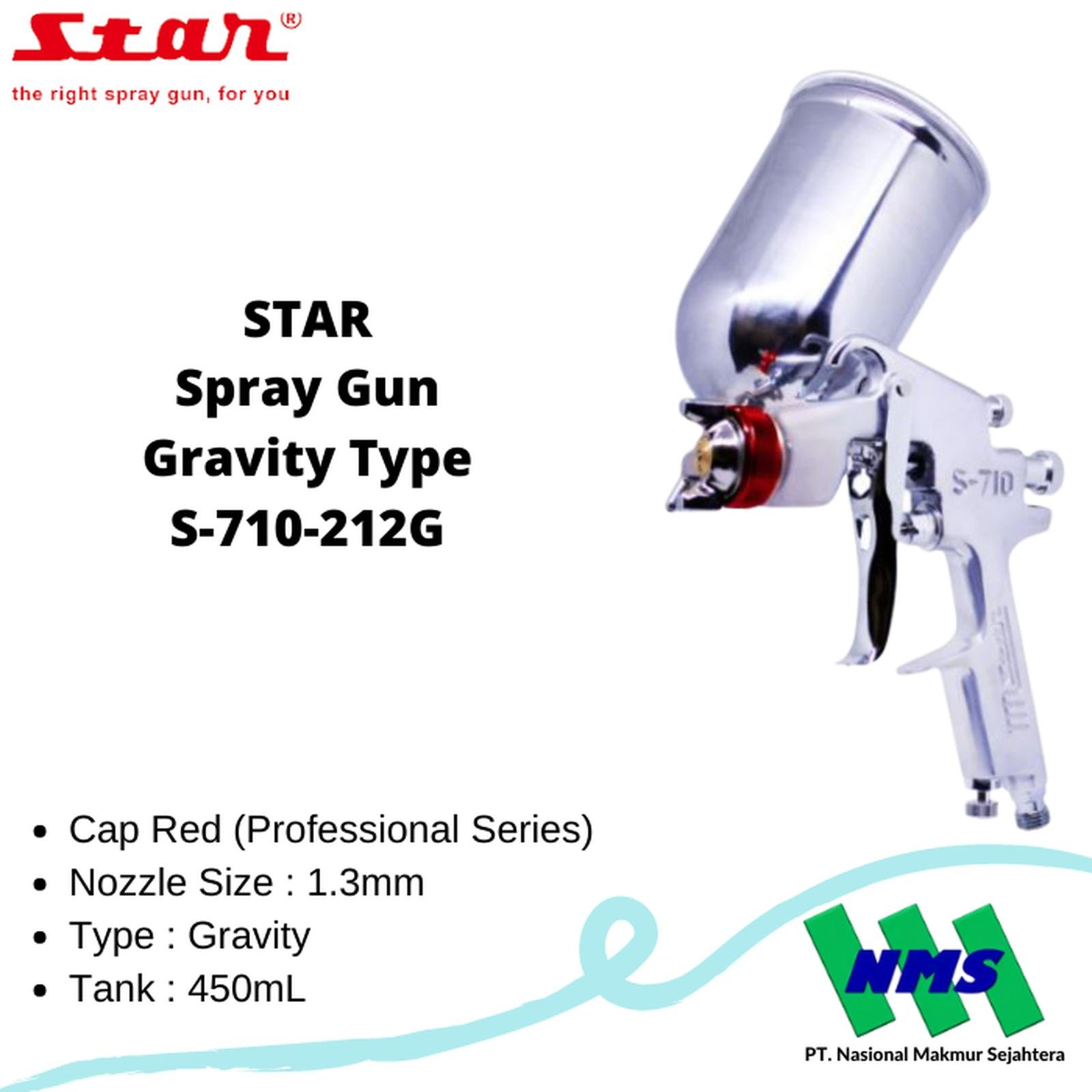 Spray gun STAR S-710-212G merupakan alat semprot cat tipe gravity feed (tabung atas) dari seri S-710, dilengkapi dengan nozzle berukuran 1,3 mm