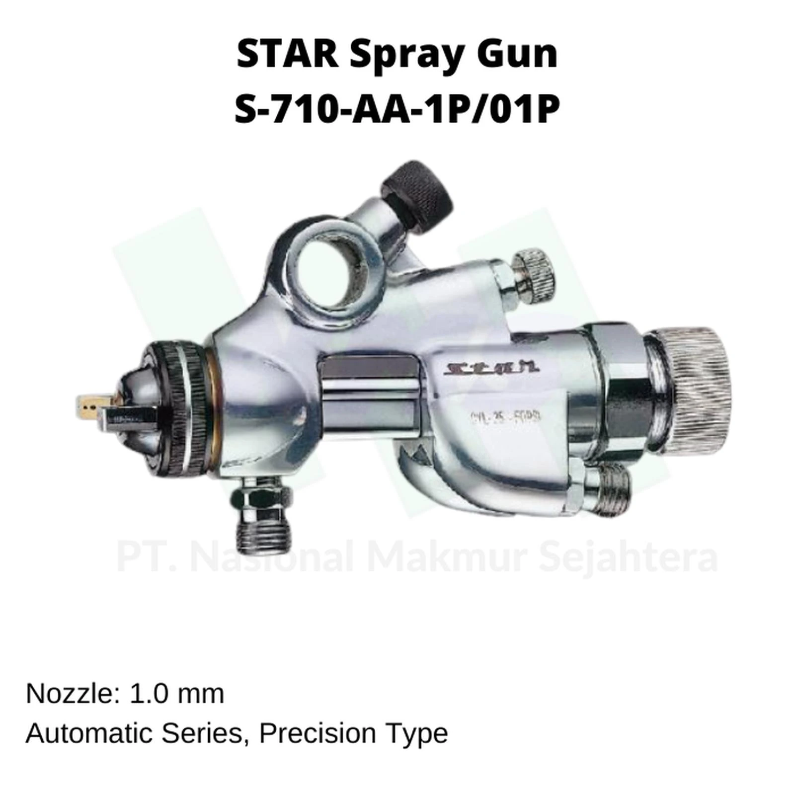 STAR Spray Gun S-710-AA-1P/01P merupakan spray gun otomatis berkualitas tinggi yang dirancang untuk kebutuhan produksi massal di industri pengecatan. Dilengkapi nozzle berukuran 1.0 mm, alat ini mampu menghasilkan semprotan halus dan merata dengan konsumsi udara sekitar 145 L/menit pada tekanan 2.5–3.5 bar.’