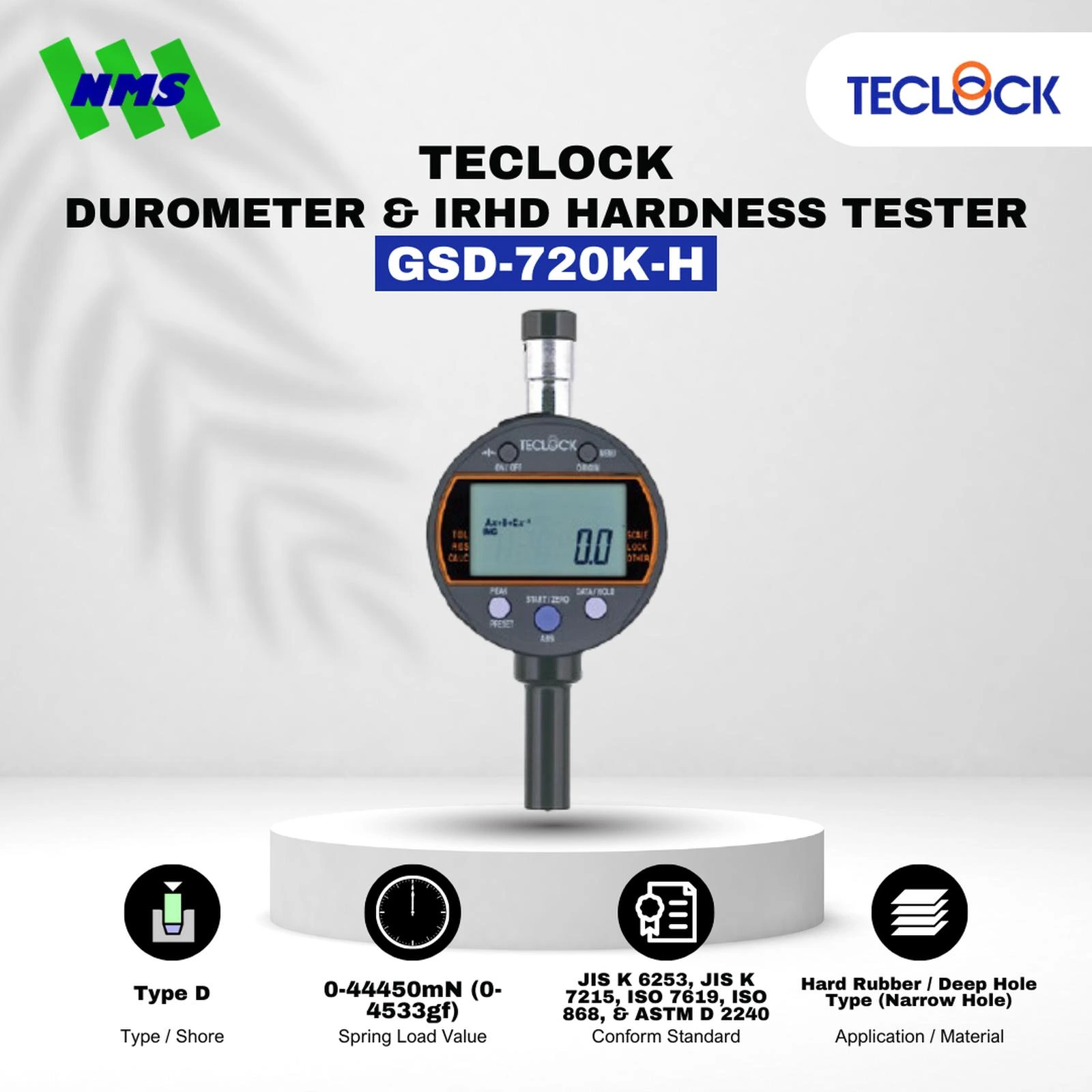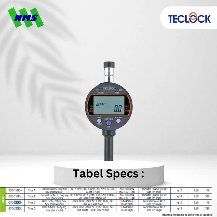 TECLOCK GSD-720K-H Digital Durometer Hardness Tester adalah alat ukur kekerasan tipe Shore D yang dirancang untuk menguji material keras seperti karet keras dan plastik padat. Model ini memiliki gaya penekanan 44.450 mN.