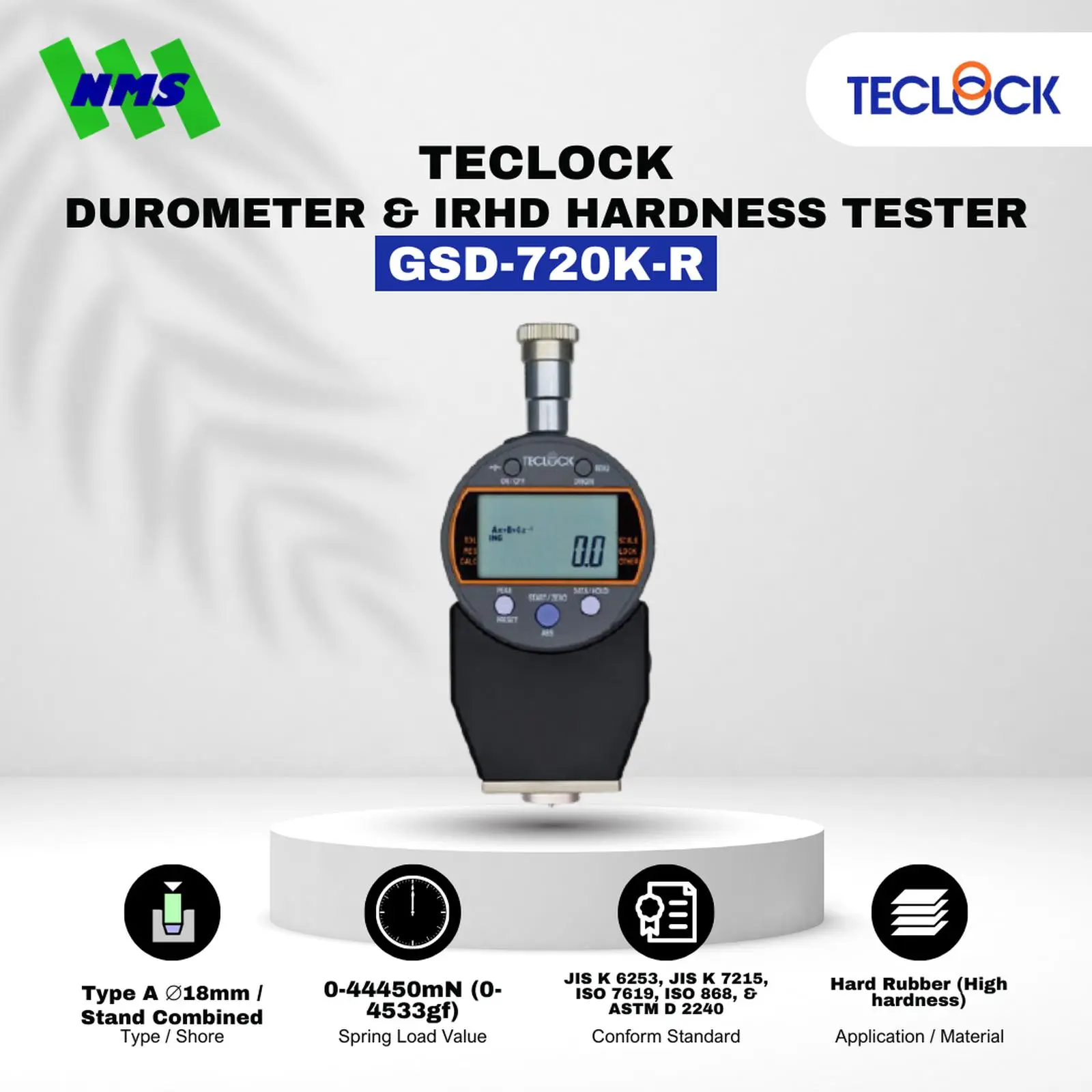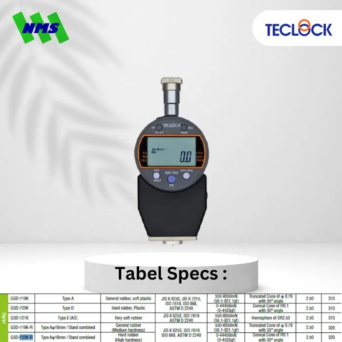 TECLOCK GSD-720K-R adalah durometer digital tipe Shore D yang dirancang untuk mengukur kekerasan material keras seperti karet padat dan plastik. Alat ini memiliki gaya pegas 0–44.450 mN.