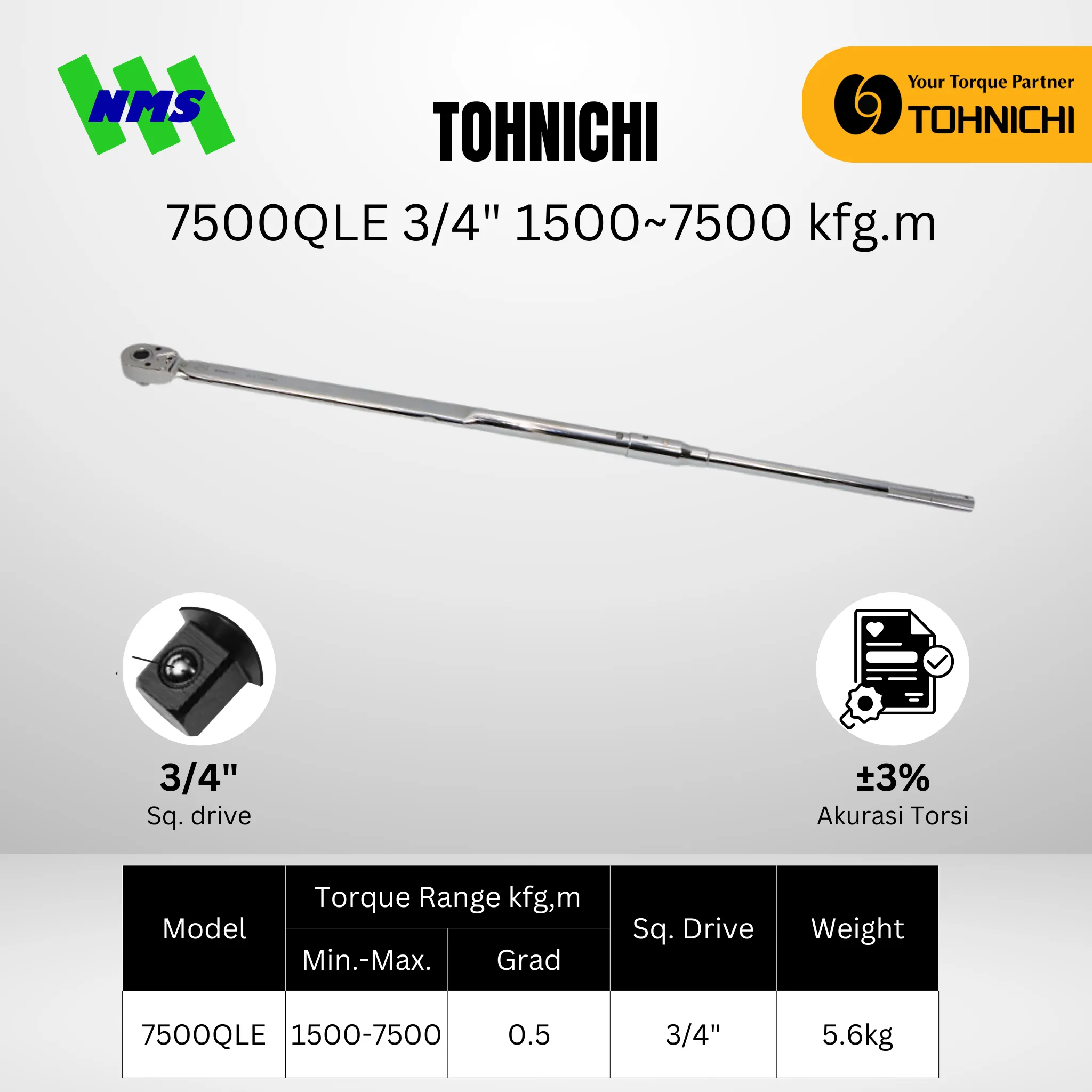 TOHNICHI 7500QLE‑3/4 adalah kunci torsi manual tipe click/adjustable dengan drive 3/4″, dirancang untuk pengencangan baut berskala besar.