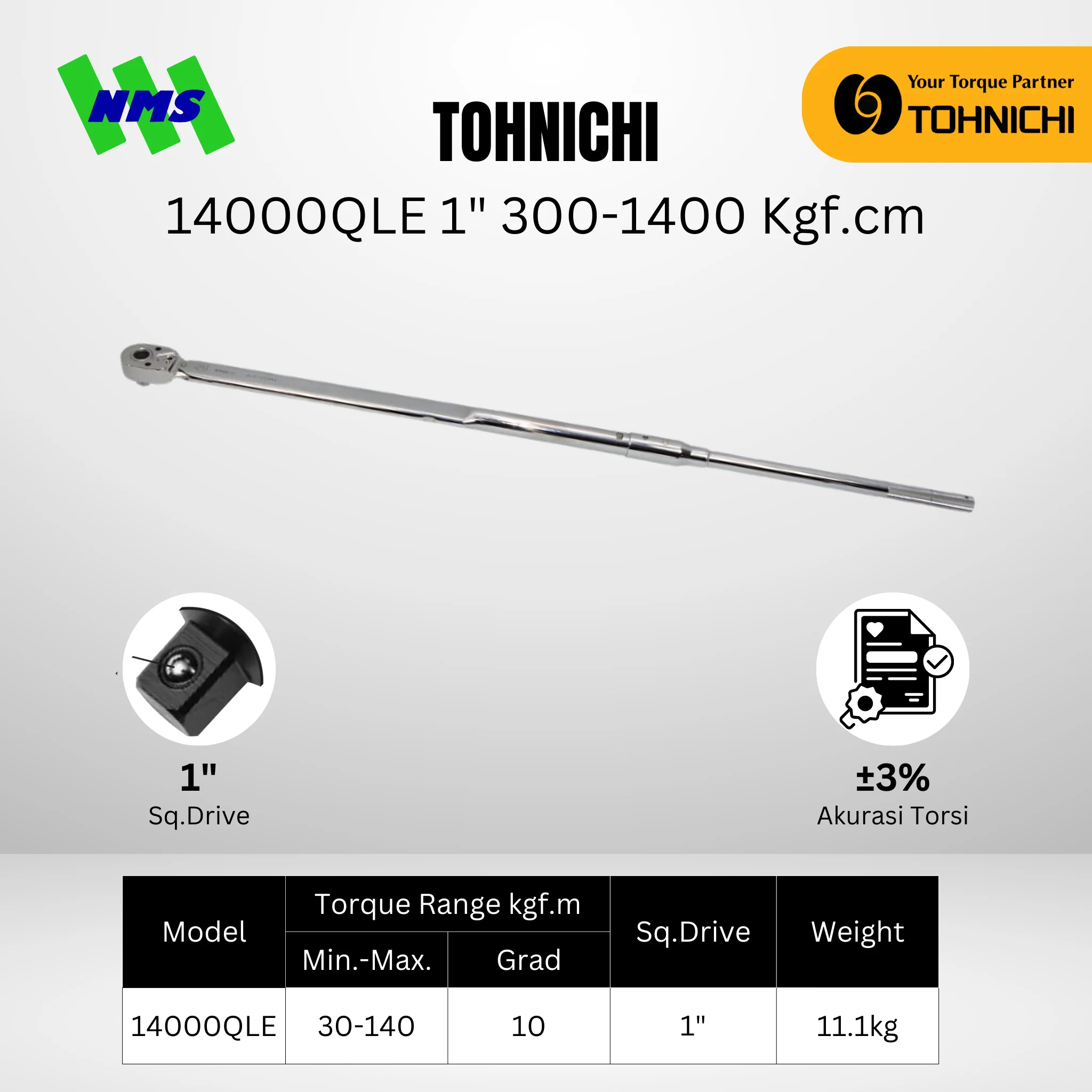 Kunci torsi TOHNICHI QLE14000QLE 1″ 3.000–14.000 kgf·cm adalah alat presisi tinggi untuk pengencangan baut dan sambungan besar di industri berat.