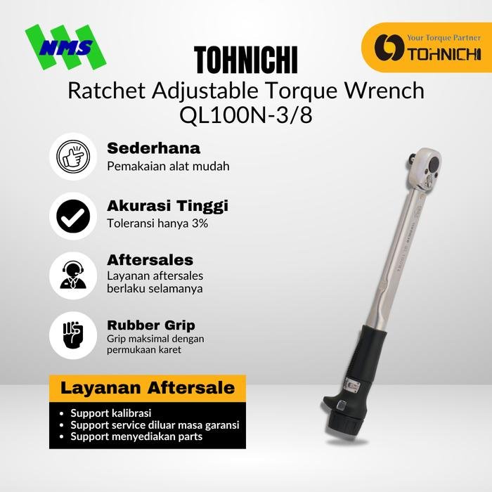 Tohnichi QL100N4 3/8″ adalah kunci torsi tipe “click” buatan Jepang, digunakan untuk mengencangkan baut dengan torsi presisi. Alat ini cocok untuk otomotif, perakitan mesin, dan perawatan umum, karena ringan, akurat, dan mudah digunakan.